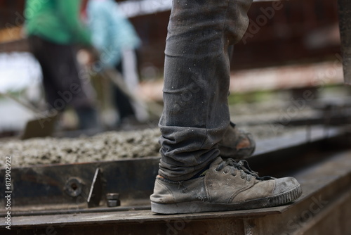 Please take a close-up photo of a laborer's feet and shoes at a construction site to celebrate Labor Day.