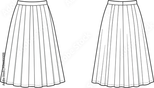 Pleated skirt sketch collection, technical drawing of uniform and wide pleats design, fashion template, knee-length garment illustration, front and back view