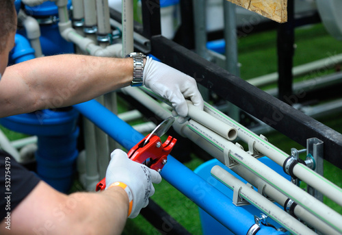 Plumber hands in gloves cut plastic pipe with the pipe cutter