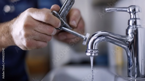 Plumber repairing a leaking faucet in a bathroom. Featuring plumbing and home repair