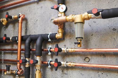 Plumbing service. copper pipeline of a heating system in boiler room