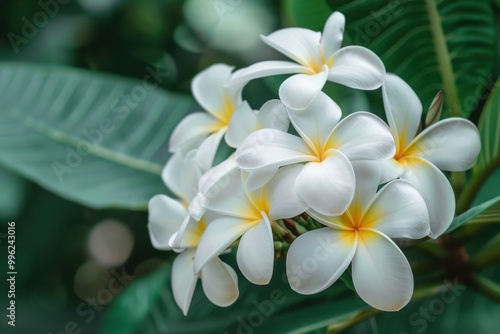 Plumeria alba is a fragrant shrub with white flowers and narrow leaves