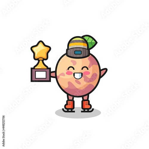 pluot fruit cartoon as an ice skating player hold winner trophy
