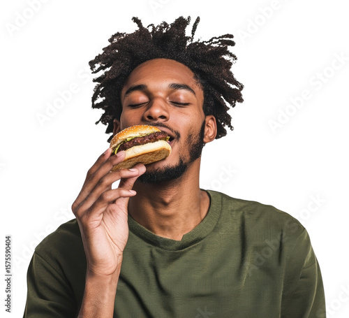 man, hamburger, background, person, african, enjoy, face, food, eye, eating, green, photo, shirt, white, body, transparent, american, element, burger, adult, happy, human, head, life events, closed, studio, half, shot, satisfying, delicious, happiness, isolated, casual attire, dining, tasty, fast, male, meal, biting