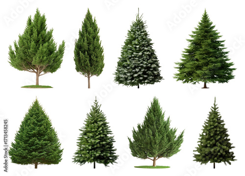 evergreen tree, illustration, transparent, collection, coniferous, botanical, evergreen, pine tree, colourful, isolated, element, foliage, variety, forest, nature, green, mixed, photo, tree, set, natural