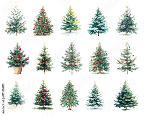 christmas tree, illustration, hand-painted, transparent, background, collection, decoration, watercolor, christmas, colourful, isolated, design, diverse, element, festive, holiday, variety, winter, mixed, tree, art, set