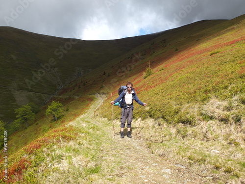 mountain, slope, road, trail, serpentine, loop, spiral, around, pawn, backpack, group, traveler, long, way, walkabout, abrupt, down, vale, canyon, sun, shadow, sky, ravine, vegetation, many-coloured, stain, greenery, shade, redhead, bush