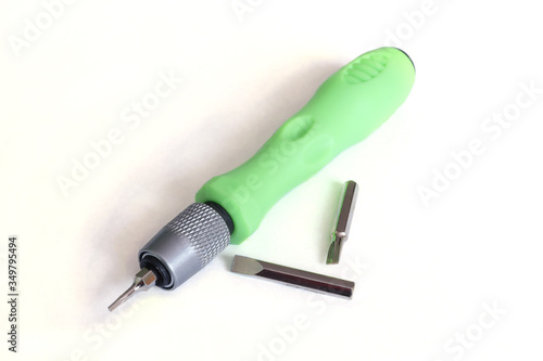 isolated, tool, screwdriver, white, equipment, work, screw, pen, metal, object, steel, instrument, repair, black, handle, plastic, green, construction, tool, blue, closeup, driver, macro