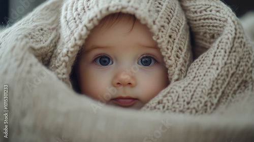 Pod miękkim kocykiem wyłania się urocze dziecko z rozczochranymi włoskami, które z ciekawością spogląda na otoczenie.