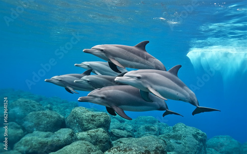 Pod of sleek gray dolphins swimming in clear blue green ocean water over rocky reef image