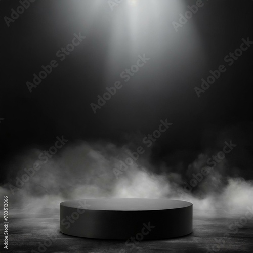 Podium black dark smoke background product platform abstract stage texture fog spotlight. Dark black floor podium dramatic empty night room table concrete wall scene place display studio smoky dust,