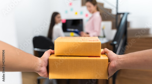 Point of view hand of courier holds the package or Parcel box delivery to the customer with blur customer background in delivery and transportation concept.