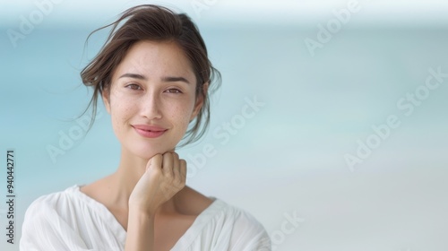 Poised mid-aged Filipino woman with dewy skin, soft-focus tropical beach backdrop, hand on face.