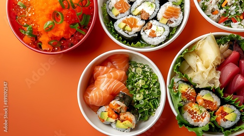 food, meal, dinner, dish, salad, cookery, vegetable, sushi, plate, rice, fish, healthy, lunch, epicure, eatery, white, seafood, isolated, cheese, fresh, delicious, eat, diet, table, soup