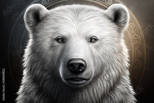 Polar bear illustration, circle with golden ornaments on the background, emblem. Generative AI