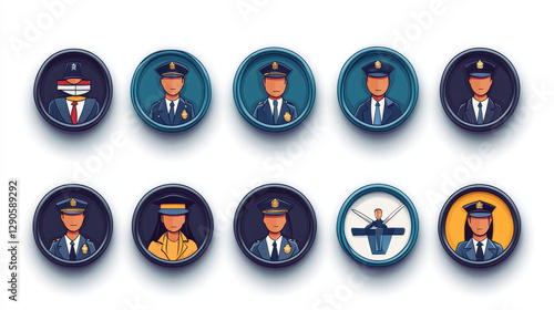 Police justice symbol icons round vector set illustration. Collection of on-duty policemen signs, symbols of policing and and justness located around place for text.