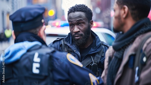 police, officer, man, street, city, conversation, talking, listening, uniform, cap, traffic, background, blur, daylight, day, hours, law, enforcement, public, safety, urban, life, communication, interaction, serious
