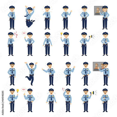 police officer, police, cartoon, officer, set, guard, isolated, person, illustration, vector, funny, cop, woman, background, character, collection, standing, security, uniform, flat, different, people, happy, hand, white, design, character, expression, job, emotion, occupation, safety, badge, crime, law, authority, justice, detective, sheriff, face, signs, template, greeting, blue, simple, gesture, victory, thumb, man