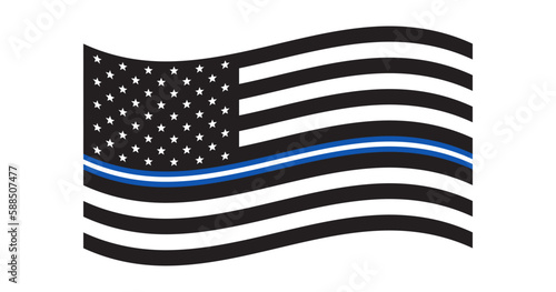 Police us flag. Patriotic symbol. Black and white US Flag with blue line.
