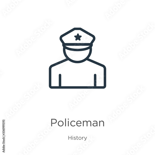 Policeman icon. Thin linear policeman outline icon isolated on white background from history collection. Line vector policeman sign, symbol for web and mobile