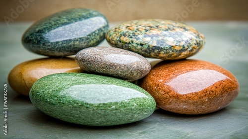 stone, pebble, rock, polished, smooth, texture, natural, colours, green, brown, orange, granite, marble, glossy, surface, detail, macro, closeup, composition, arrangement, balance, light, shadow, shine, vibrant, earthy, organic, mineral, geology, nature, zen, spa, wellness, meditation, calm, serenity, beauty, abstract, pattern, design, background, element, object, decorative, artistic, aesthetic, visual, sharpened
