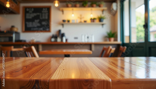 Polished wooden tabletop in cozy cafГ© setting, warmth and quality