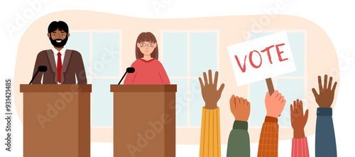 vote, voting, people, election, campaign, concept, political, democracy, speaker, copy space, us, america, poster, banner, right, speech, american, politic, tribune, day, choice, national, presidential, speaking, hand, voters, selection, vector, flat, democratic, government, elect, raised, illustration, character, dais, background, united, choose, select, racked, state, different, november, 2