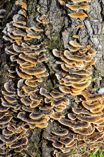 Polypore mushroom Trametes versicolor - tree mushroom on old rotten stump, Ukraine