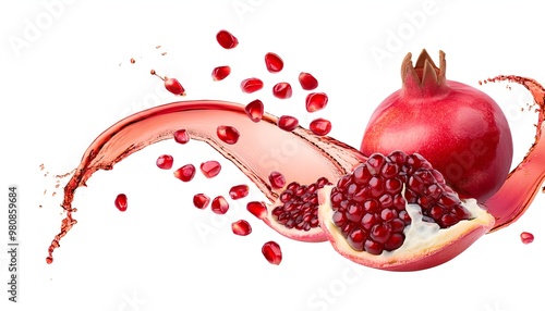 pomegranate, fruit, food, red, isolated, ripe, healthy, white, seed, sweet, fresh, juicy, dessert, tropical, vegetarian, freshness, garnet, antioxidant, cut, juice, diet, half, closeup, organic, nature