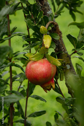 Pomegranate on tree branch, Red ripe pomegranate fruits grow on pomegranate tree in garden, Close up of pomegranate to produce a delicious juice