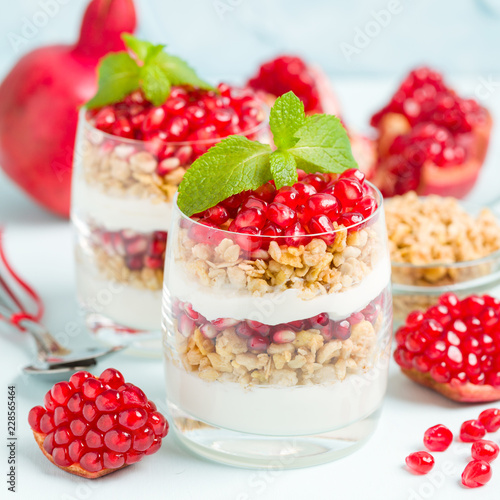 Pomegranate parfait - sweet organic layered dessert with granola flakes, yogurt and red ripe fruit seeds.