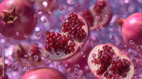 pomegranate, seed, fruit, red, background, fresh, food, juicy, healthy, sweet, delicious, close, up, still, life, nature, vitamin, diet, organic, nourishment, burst, ruby, gemstone, gem, sparkling, flying, floating, levitation, abstract, purple, pink, blue, vibrant, texture, shiny, surreal, macro, studio, shot, graphic, design, artwork, creative, concept, element, detail, nobody