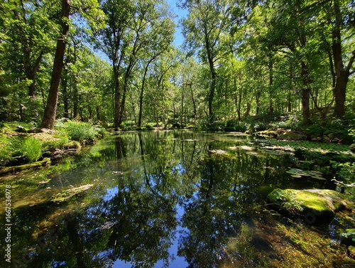 duck pond, water, tree, forest, nature, landscape, scenic, summer, green, park, foliage, wood, sunlight, moss, lily, pad, algae, vegetation, tranquil, peaceful, serene, idylli, lush, overgrowth, sky, blue, daylight, outdoors, environment, plant, growth, natural, calm, clear, surface, background, scene, beauty