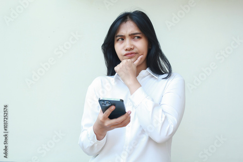 thoughtful, asian, woman, phone, employee, mobile, smartphone, pensive, isolated, message, thinks, holding, text message, girl, young, confused, person, hand, dreaming, doubt, plan, question, adult, suspicious, lifestyle, secretary, chat, solution, serious, application, cellular, wonder, attractive, pretty, female, portrait, tech, charming, business, work, office, looking, gorgeous, chinese, indonesian, mobile phone, cute, browsing