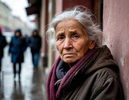 grandmother, elderly, woman, poor, lonely, city, urban, closeup, wrinkle, sorrowful, isolation, homeless, despair, hardship, ageing, coat, foulard, eye, grieved, survival, pavement, bench, winter, cold, dusk, shadow, vulnerability, disused, realism, emotional, ai, generated, struggle, dignity, resilience, forgotten, human, quiet, melancholy, stillness, portrait, expression, story, social, issue, compassion, awareness, wants