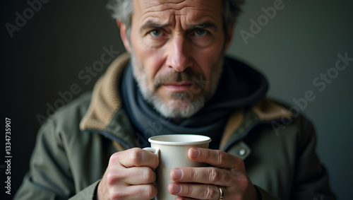 Poor tired depressed hungry homeless man holds a paper mug in his hands. Help and money. Nostalgia and hope concept. concept as A somber depiction of a tired homeless man holding a paper mug represent