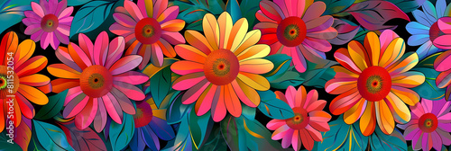 pop art graphic flowers in various shades of pink, yellow, and orange arranged in a colorful pattern