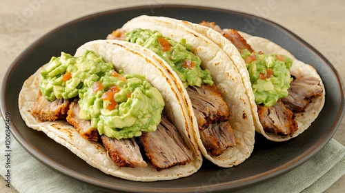 Pork carnitas tacos served with creamy guacamole and chili sauce
