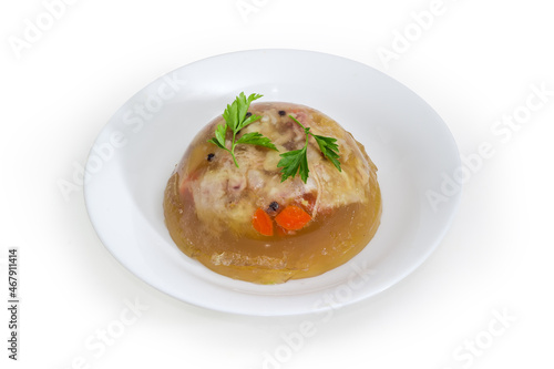 aspic, food, kitchen, cooking, cookery, prepared, cooled, ingredient, meat, pork meat, spice, gelatin, broth, decorated, parsley, fresh, twig, portion, serving, dish, white, isolation