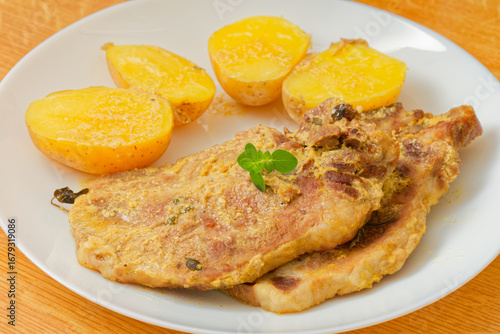 Pork meat with mustard and potatoes on plate