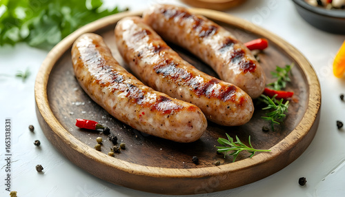 pork meat, sausage, plate, light, background, meat, protein, breakfast, lunch, dinner, grilled, fried, cooked, brown, gold, crispy, juicy, savoury, delicious, link, casing, natural, artificial, seasoned, spiced, herb, salt, pepper, garlic, fennel, paprika, sage, traditional, homemade, butcher, shop, deli, eatery, cafes, kitchen, white, ceramic, studio, photo, food, styling, appetising, tempting, fresh