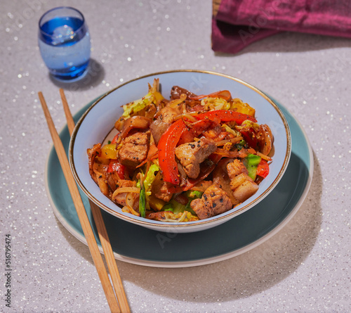 stir fry, pork meat, onion, chopstick, asian, chinese cuisine, food, noodle, pepper, seasoning, cabbage, meat, pig, sliced, diced, meal, lunch, dinner, summer, healthy, traditional, protein, delicious, tasty, deliciously, favor, nutrient, nourishment, diet, cookery, chinese, asian cuisine, up high, white