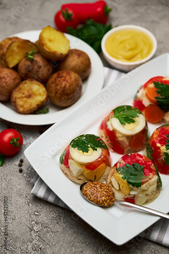 aspic, broth, chicken, cold, delicious, dinner, food, gelatin, epicure, homemade, jelly, meal, meat, bouillon, cookery, culinary, gastronomy, healthy, herb, ingredient, natural, nutrient, nourishment, organic, tasty, traditional, transparent, vegetable, carrot, egg, cooked, lunch, pork meat, ukrainian, portion, plate, napkin, fork, knife, concrete, table, mustard, potato