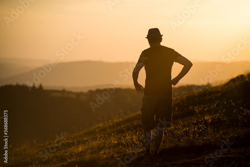 Portrait of man silhouette standing at the top of the mountain looking the lanscape on sunset background