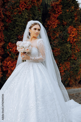 Portrait. A brunette bride in a dress and a veil, with a chic crown, poses with a bouquet. Silver jewelry. Beautiful makeup and hair. Autumn wedding. celebration