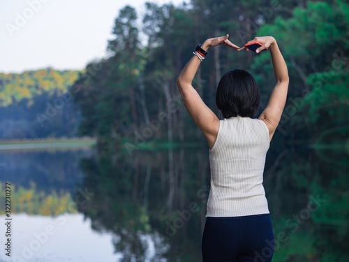 woman, raised, arm, heart shape, lake, 40s, achievement, adult, aspiration, carefree, color image, contemplation, courage, female, freedom, freshness, happiness, happy, harmony, horizontal, inspiration, joyful, lady, leadership, avocation, lifestyle, morning, nature, one person, outdoors, people, relaxation, relaxed, relaxing, standing, success, sunbeam, tranquil scene, calmness, travel destination, vacation, vitality, water, waterfront, young adult, missy