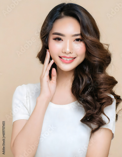 portrait beautiful asian woman, beige background concept skin care, makeup
