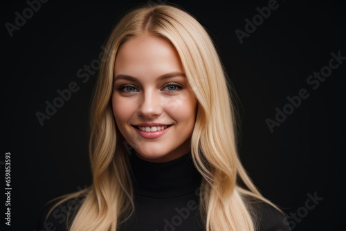 Portrait beautiful blonde model woman with white teeth smile, healthy long hair and beauty skin on black background. Concept of advertising dentist and facial care. Generative AI