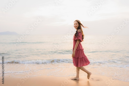Portrait beautiful young asian woman happy smile leisure on the beach sea and ocean