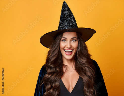 portrait, cheerful, woman, magician, costume, amazed, excited, bright, yellow, background
